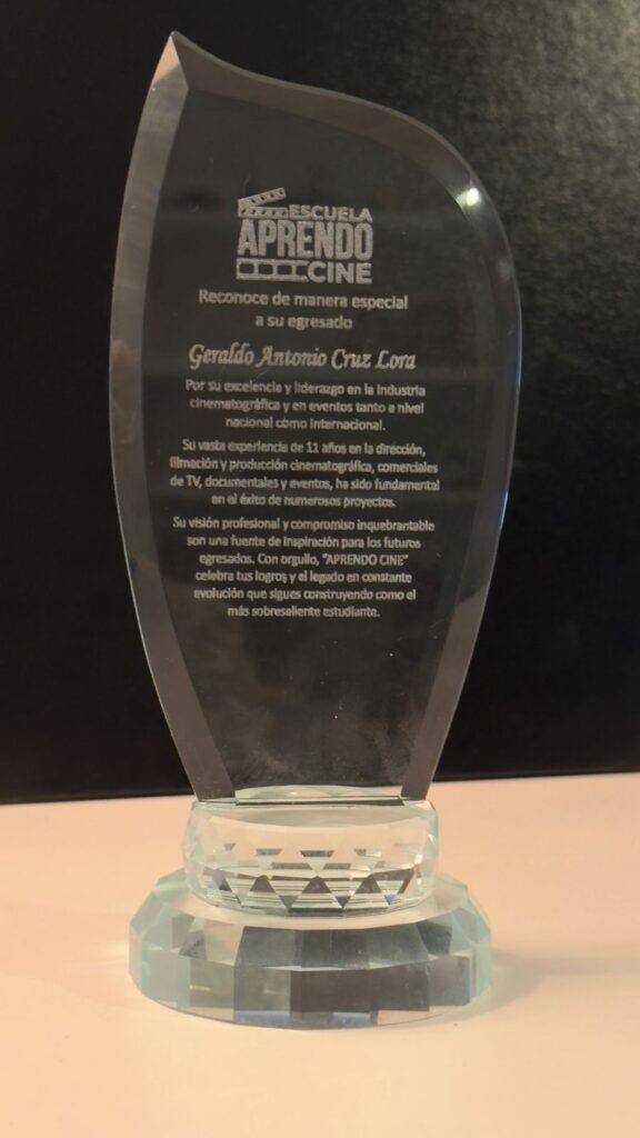Recientemente reconocido con el más alto honor cómo el egresado más sobresaliente por la Escuela Aprendo Cine RD, Gerald se consolida como un ejemplo de dedicación, innovación y visión estratégica llevando valor al mundo del cine y la televisión.